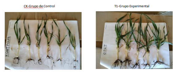 Se seleccionaron aleatoriamente seis plantas de trigo en el campo de cada grupo para comparar el crecimiento de las partes aéreas y las raíces tras aplicar diferentes métodos de tratamiento de semillas con el extracto de algas. Los resultados detallados se muestran en la tabla siguiente:
