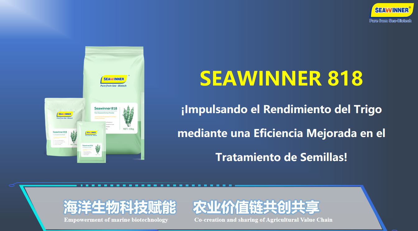 Seawinner 818 es un innovador extracto de algas elaborado con la tecnología patentada de Seawin. Este extracto de algas de alta calidad es casi neutro, destaca por su mayor contenido de ácido algínico y reguladores de crecimiento vegetal (RCV), a la vez que retiene diversos aminoácidos provenientes de las algas. Además, los grupos funcionales presentes en este extracto de algas quelatan 5 tipos de elementos secundarios y oligoelementos, convirtiéndolo en una opción ideal para un tratamiento de semillas eficaz en el cultivo de trigo.