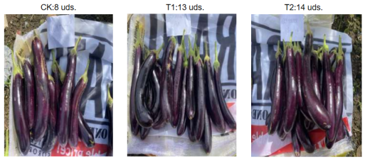 Una vez finalizado el ensayo, se cosecharon y contabilizaron íntegramente todas las berenjenas comerciales de las parcelas experimentales. Los datos revelaron un impresionante aumento del 62.5% al 75% en la cantidad de frutos, lo que destaca la excelente capacidad de Nutree para incrementar los rendimientos de los cultivos.