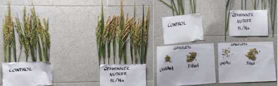 Según el ensayo de campo anterior, se demostró que la aplicación foliar de Nutree en arroz promueve un crecimiento robusto de las plantas, aumenta el grosor de los tallos y provoca un follaje de color verde oscuro en la etapa de llenado de granos. Además, este tratamiento indujo un aumento del 11.82% en el número de hijuelos, un incremento del 2.9% en el número de espiguillas de arroz, un crecimiento del 5.37% en el número de granos llenos y una reducción del 6.3% en el número de granos vacíos.