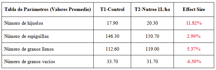 Se aplicó Nutree mediante aspersión foliar a razón de 1 L/ha el día 20 y el día 27 respectivamente después del trasplante del arroz. Los resultados del ensayo se presentan a continuación: