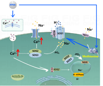 APAA activates Ca²⁺ channels and the SOS1 protein signaling pathway to drive the sodium ion (Na⁺) efflux system. At the same time, it enhances the activity of the sodium-potassium pump, consuming energy (ATP) to expel excess sodium ions from the cell while absorbing potassium ions (K⁺). This helps maintain an ideal intracellular K⁺/Na⁺ ratio and alleviates ion toxicity.