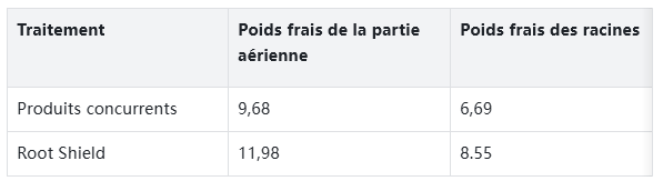 • Traitements expérimentaux : Root Shield 60 L/ha (arrosage au sol), produits concurrents 60 L/ha (arrosage au sol)